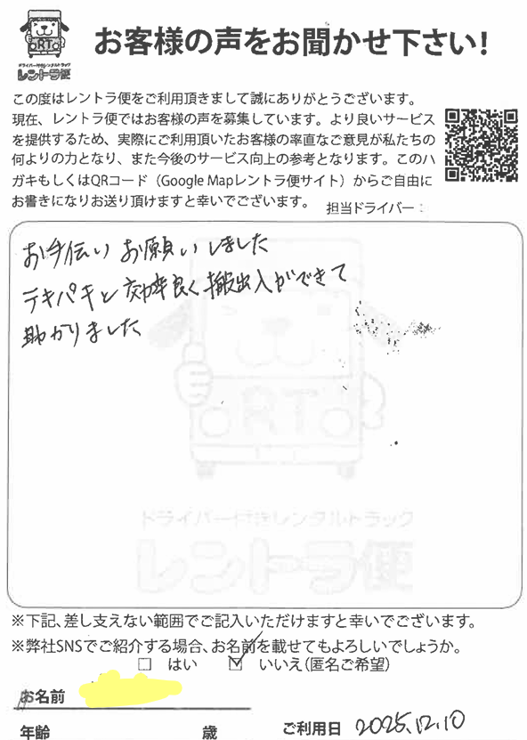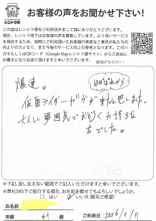 この度は運転手付きレンタカートラック【レントラ便】をご利用頂きまして、誠にありがとうございました。