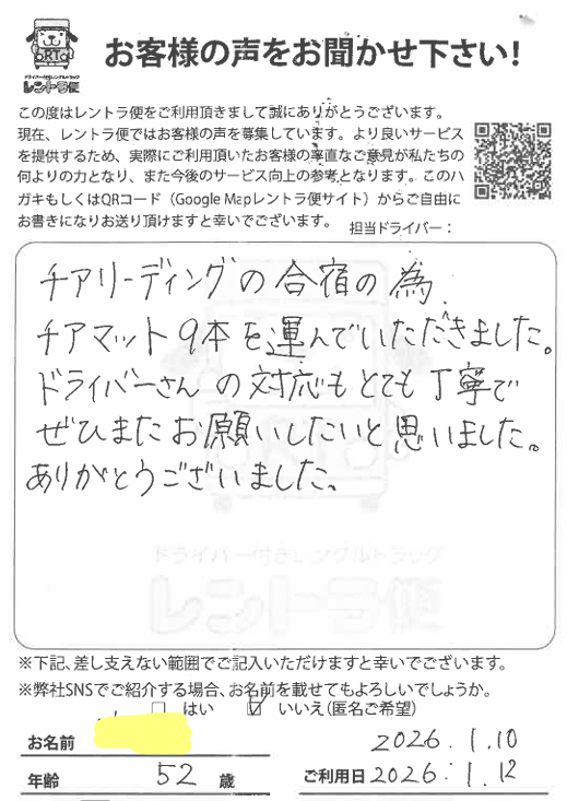 2026年1月10日(土)にチアリーディングの合宿の往復の運搬でレントラ便をご利用頂きましたチアリーディングクラブの先生からのお葉書です。