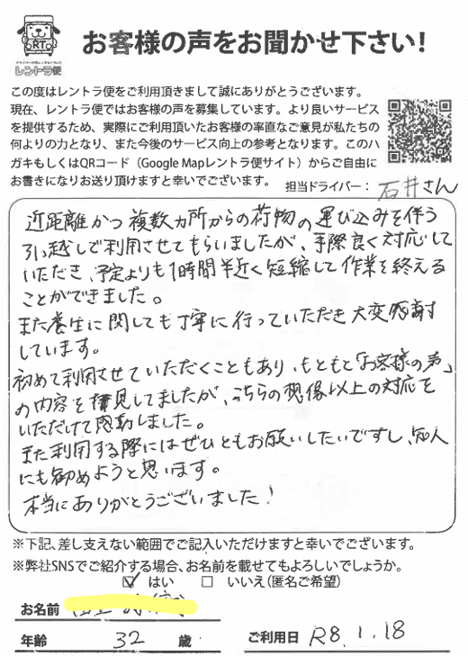 2026年1月18日(日)に船橋市内間で近距離かつ複数個所からの単身引っ越しでレントラ便をご利用頂きましたお客様からのお葉書です。