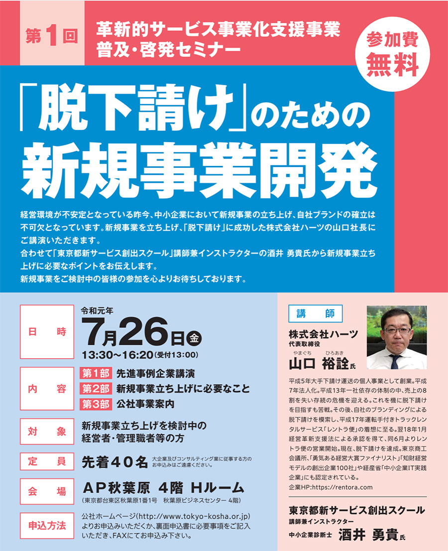 | 2019(令和1)年 | ・2019年7月26日(金)秋葉原にて、代表の山口が【第1回革新的サービスの事業化支援事業 普及・啓発セミナー「『脱下請け』のための新規事業開発(東京都中小企業振興公社主催)」】と題し、レントラ便の軌跡を2時間講演しました。![]() |