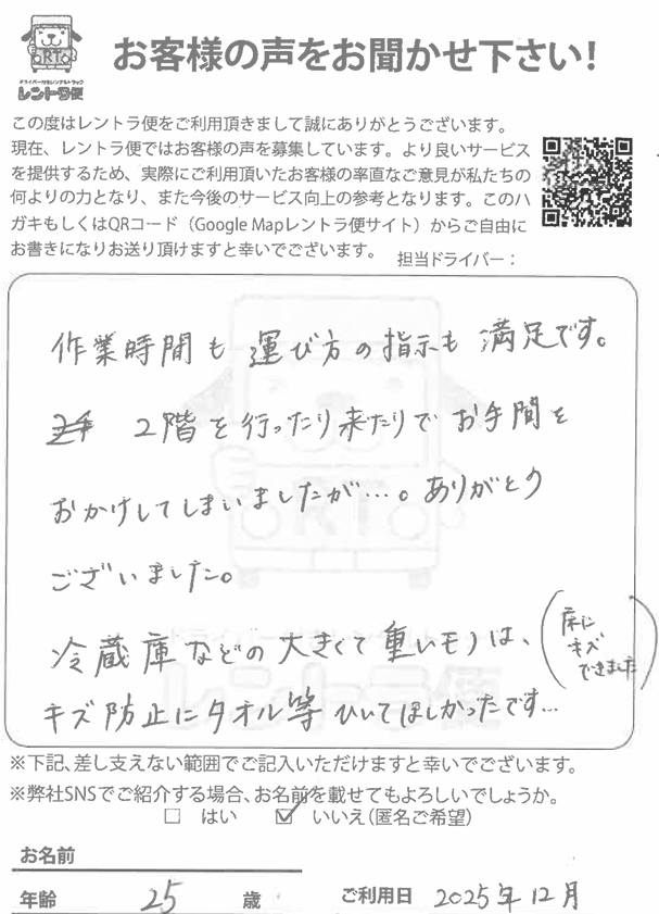 レントラ便はトラックとドライバーがセットになった時間料金制のレンタルトラックサービスです。「親切、丁寧でしかもリーズナブル!」と、大変ご好評をいただいております。ドライバーは運転や荷物の積み込み、積み下ろし以外にも、時間内ならお客様のご要望に添ったお手伝いをいたします。