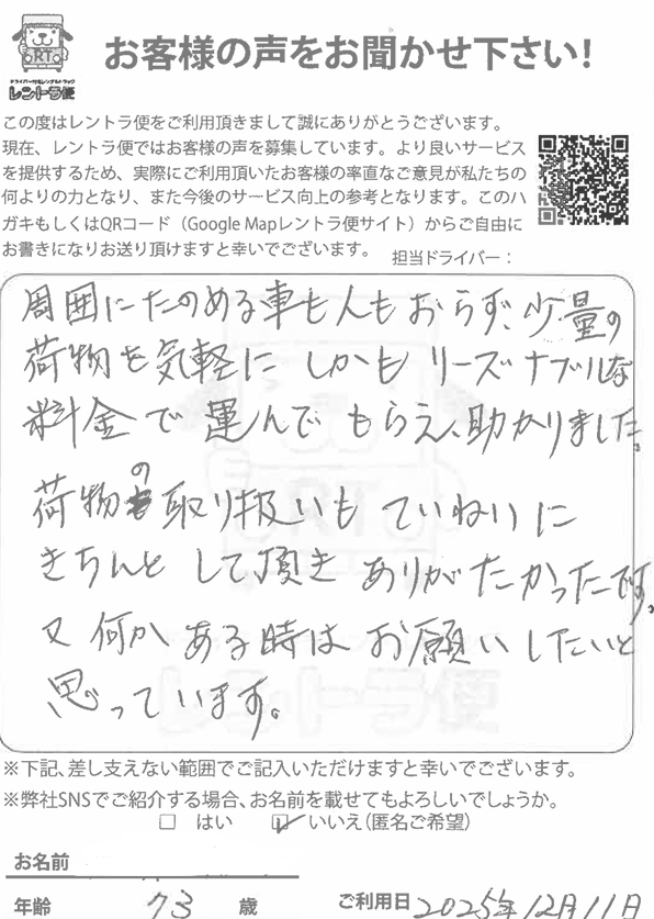 レントラ便の自慢はドライバー私たちは、料金の安さだけでなく「ドライバー」がとても重要だと考えます。お客様目線で気持ちの良いサービスを提供できるドライバーの育成、教育に努めています。当社のドライバーは、一度ご利用いただいたお客様からご指名をいただくことも。女性やシニアのお客様からも、「安心して頼れる」と、うれしいお声をいただいてます。