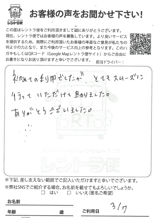 レントラ便の自慢はドライバー私たちは、料金の安さだけでなく「ドライバー」がとても重要だと考えます。お客様目線で気持ちの良いサービスを提供できるドライバーの育成、教育に努めています。当社のドライバーは、一度ご利用いただいたお客様からご指名をいただくことも。女性やシニアのお客様からも、「安心して頼れる」と、うれしいお声をいただいてます。