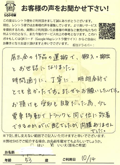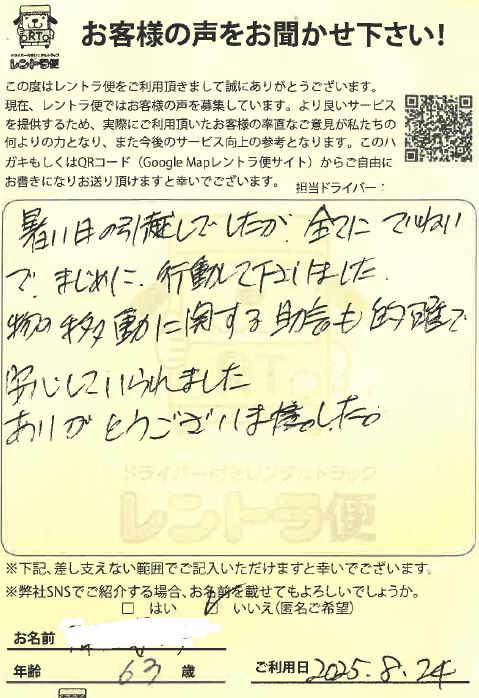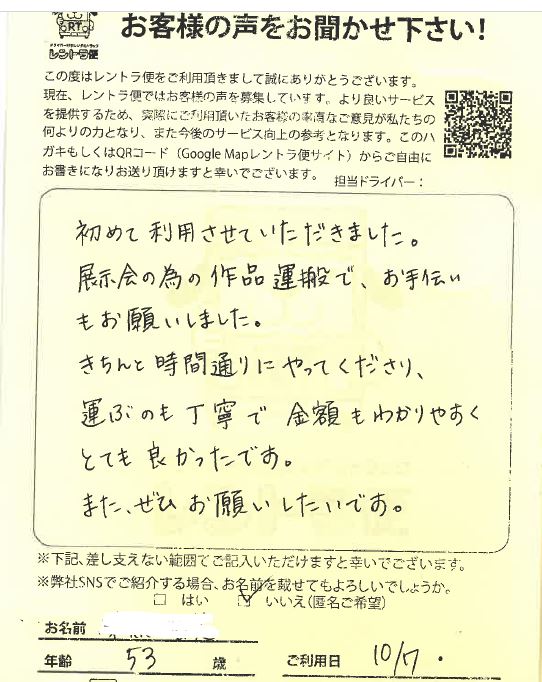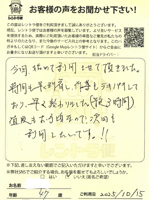 レントラ便の自慢はドライバー私たちは、料金の安さだけでなく「ドライバー」がとても重要だと考えます。お客様目線で気持ちの良いサービスを提供できるドライバーの育成、教育に努めています。当社のドライバーは、一度ご利用いただいたお客様からご指名をいただくことも。女性やシニアのお客様からも、「安心して頼れる」と、うれしいお声をいただいてます。