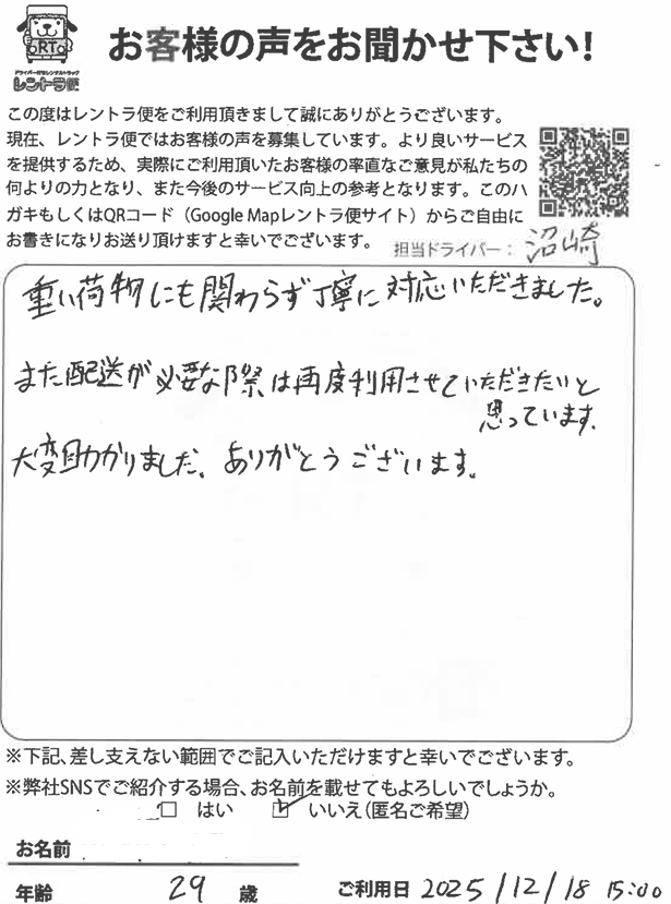 2025年12月にお引越しでレントラ便をご利用頂きました25歳のお客様からのおハガキです。