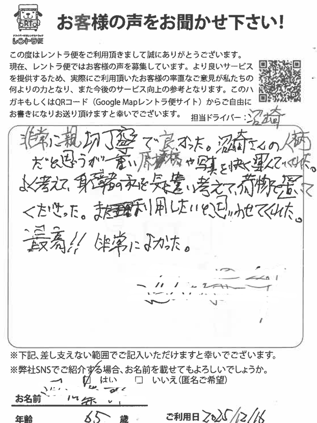 2025年11月28日(金)にご高齢の方のお引越しでレントラ便をご利用頂きましたお客様からのおハガキです。
