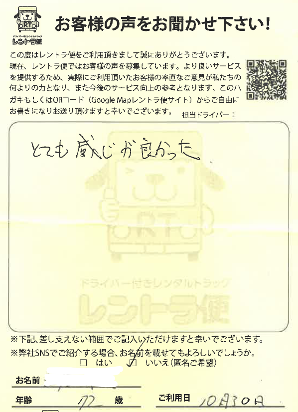 この度は運転手付きレンタカートラック【レントラ便】をご利用頂きまして、誠にありがとうございました。