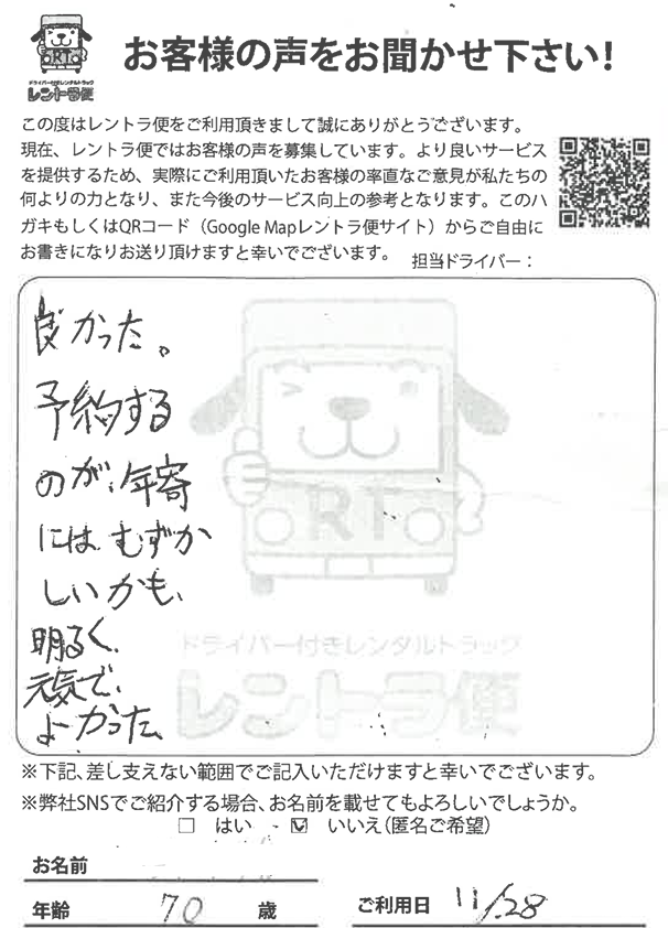 この度は運転手付きレンタカートラック【レントラ便】をご利用頂きまして、誠にありがとうございました。